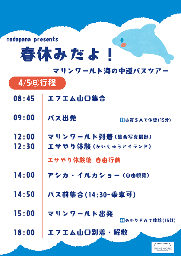 🐬参加者募集中🐬madapana presents 春休みだよ!マリンワールド海の中道バスツアー🚌 投稿者: kouno2026年3月6日2026年3月6日pickup、お知らせ、番組情報 今年も開催!madapana presents 春休みだよ!マリンワールド海の中道バスツアー! 日程は、4月5日(日)。小学生までのお子様がいらっしゃるご家族を無料ご招待します。 ただいま参加申し込み受付中! エサやり体験もありますよ!マリンワールドで心躍る“海の世界”を一緒に楽しみませんか? 今年も開催!madapana presents 春休みだよ!マリンワールド海の中道バスツアー! 日程は、4月5日(日)。小学生までのお子様がいらっしゃるご家族を無料ご招待します。 ただいま参加申し込み受付中! エサやり体験もありますよ!マリンワールドで心躍る“海の世界”を一緒に楽しみませんか? ◆注意事項◆ 小学生までのお子様がいるご家族が対象です。 応募多数の場合は抽選とさせていただきます。 3月18日までに当選者の方には当選メールをお送りいたします。 ご連絡がなかった方は落選となります。※携帯のメールアドレスをご利用の場合、弊社からのメールが届かないことがあります。 ドメイン指定受信で「@fmy.co.jp」を受信できるように設定をお願い致します。 バスにチャイルドシート等の設置はできません。1人で座れない小さなお子様は、必ず保護者の方の膝の上で安全の確保をお願いします。 昼食は各自でご用意ください。 エサやり体験は3歳以上のご参加となります。 イベントの様子は映像・写真撮影させていただきます。撮影した映像や写真は、ホームページ、SNS、イベントの告知等に使用させていただきます。 イベント中にインタビュー収録(音声)をさせていただきます。収録した音声は、番組(madapana)で使用させていただきます。 参加者同士のトラブルに関して主催者は責任を負いかねます。 ご参加までの交通に関するトラブル、事故等について主催者は一切責任を負いません。 キャンセルの場合は、事前に事務局までお知らせください。 【事務局】エフエム山口 tel.083-923-2100(平日09:30~18:00) お申込みは、下のボタンをクリック or タップして専用申込フォームから! お申込みは、下のボタンをクリック or タップして専用申込フォームから! 参加申込フォーム 締め切りは、3月15日(日)23時59分です。 締め切りは、3月15日(日)23時59分です。