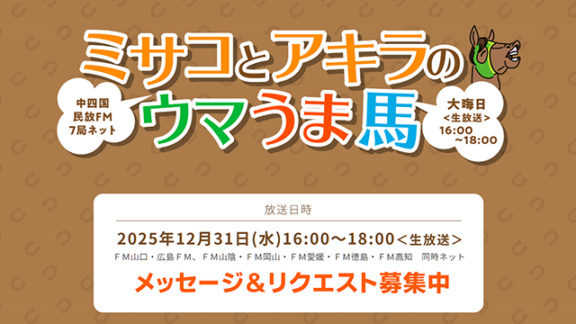 🐴特別番組🐴「ミサコとアキラのウマうま馬」メッセージ&リクエスト募集中 投稿者: kouno2025年12月10日pickup、番組情報 今年移転40周年を迎えた中四国唯一の地方競馬「高知けいば」から大晦日にお送りする恒例の特別番組。 皆さんからのメッセージ&リクエストを募集中! 抽選で高知けいばオリジナルグッズをプレゼント。 番組オフィシャルサイトへ 放送日時 2025年12月31日(水)16:00~18:00<生放送> 出演 伊藤実沙子(FM高知) 井坂彰(FM愛媛)