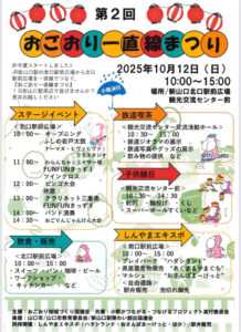 観光交流センター前では、『子ども縁日』を開催します。射的や輪投げ、スーパーボールすくい等、子どもがお祭りで楽しめる縁日です。観光交流センターの中では、『鉄道喫茶』を開催します。鉄道ジオラマの展示や、鉄道写真、グッズの展示、飲み物も提供する喫茶店も中では実施しています。