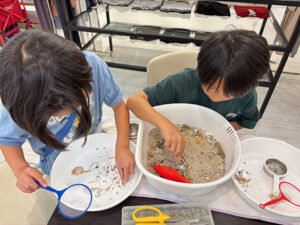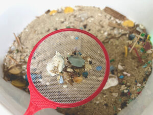 参加者は砂浜の砂をすくい、海にあるべきではない色鮮やかなプラスチック片を選び、それをキーホルダーなどアクセサリーの一部として封じ込めて持ち帰ります。