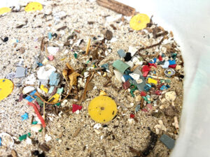 美しい海の風景が目に浮かぶ周防大島ですが、実際には浜辺にはポイ捨てされた食べ物のゴミや袋、そして海水や紫外線によって細かく砕かれたマイクロプラスチックが大量に打ち上げられています。