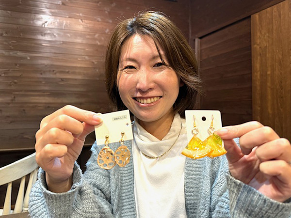 アトリエまりこあめさんは、規格外とされたみかんや蓮根などの柑橘類を素材に、レジンアクセサリーを制作しています。