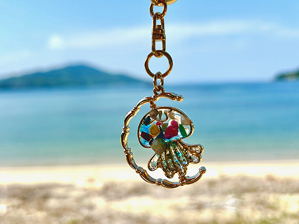 アトリエまりこあめさんは、ほかにも周防大島の海に流れ着いた海洋ゴミを素材にしたアクセサリー制作にも取り組んでいます。