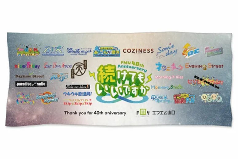 40年間を彩った様々な番組のロゴをあしらったフルカラーフェイスタオルです。