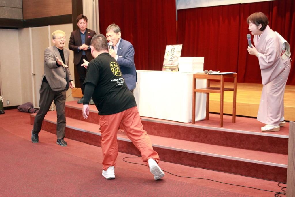「幸せへのカウントダウン」中締めの音頭は、3月14日ちょうどこの日、たこ焼き店「タコっちゃ」の1周年を迎えた津原政志さんにお願いしました。