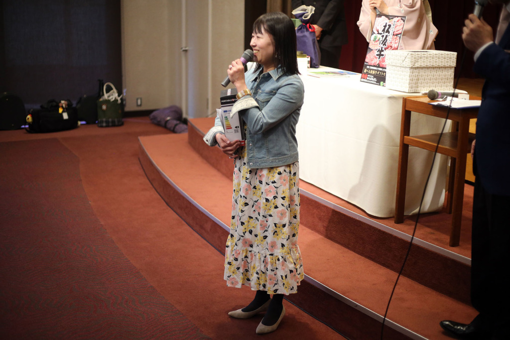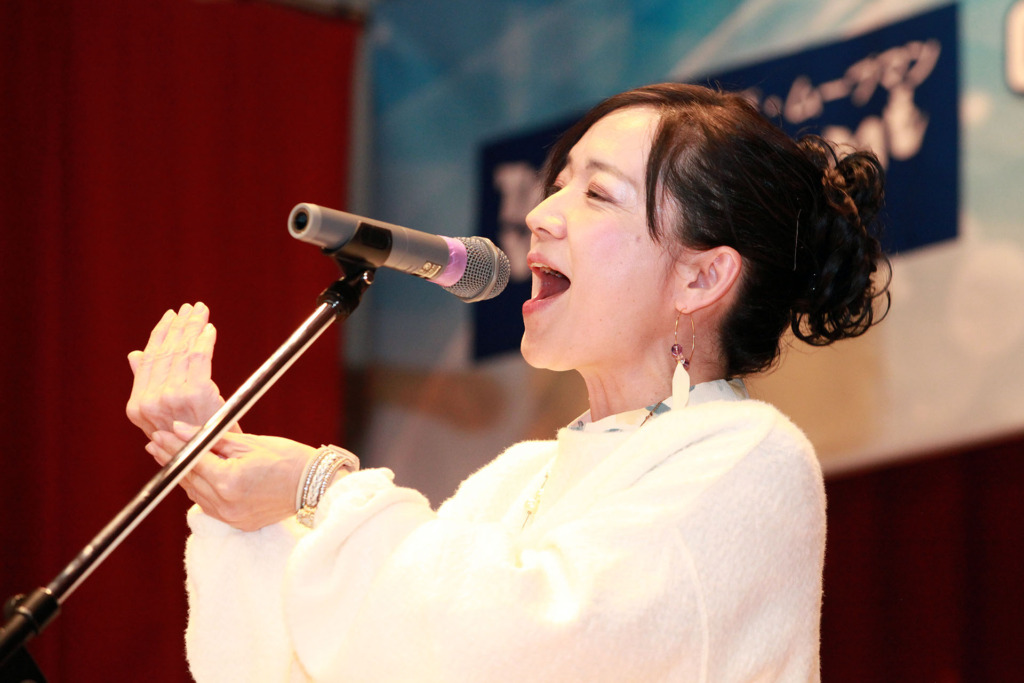 音楽パフォーマンスグループ「おんがくこうじょう。」リーダーの川添康子さんが、森山良子の「アレアレアレ」を手振り交えてコミカルに熱唱♪Ale Ale Ale