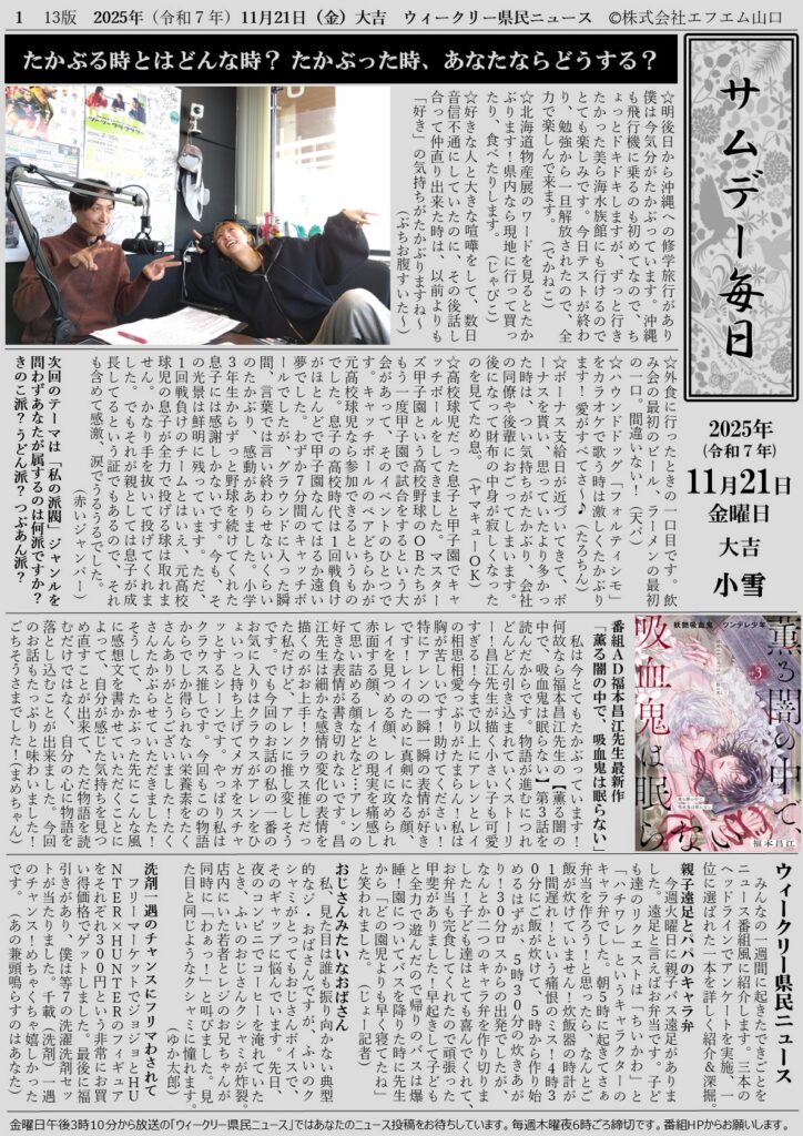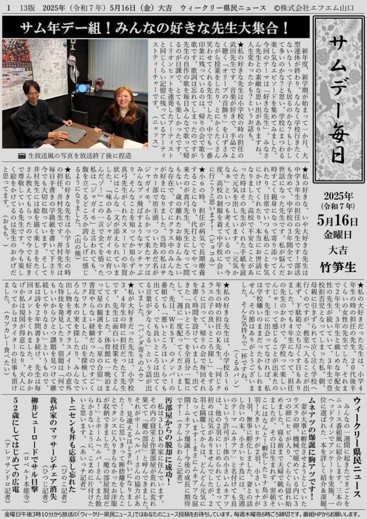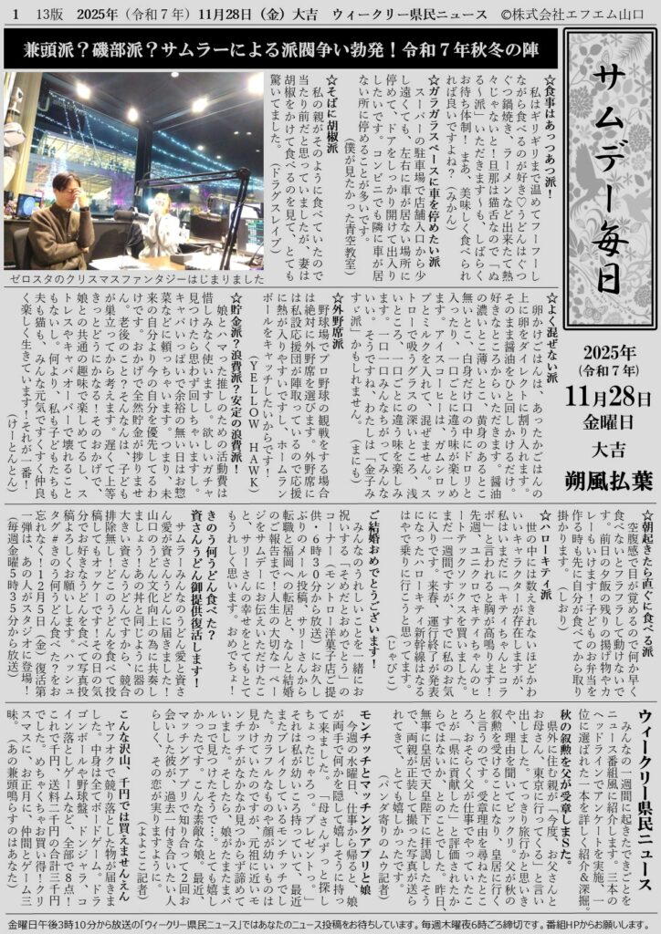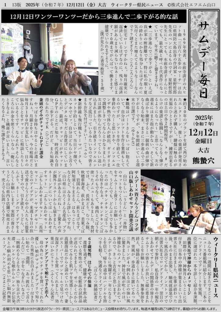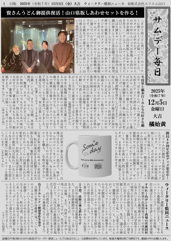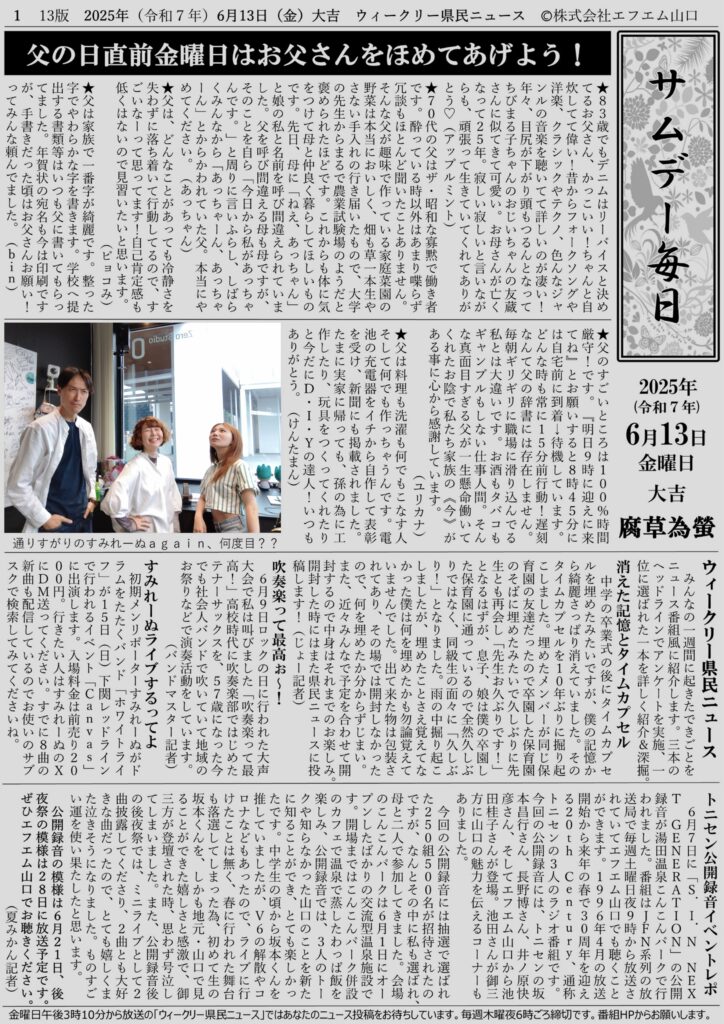 サムデー毎日毎週更新! 投稿者: Somedayスタッフ2025年12月13日2025年12月13日 4 そめだ編集長によるウィークリー県民ニュースまとめ新聞 コーナーへの投稿は毎週木曜夜6時30分ごろ締め切ります。 サムデーのメッセージフォーム あなたの投稿が放送と紙面を作ります。 ニュースといっても自分ニュースですから、ふつおた感覚で・・・ 日々の生活の中にあった「ちょっと言いたいこと」をメールしてください。