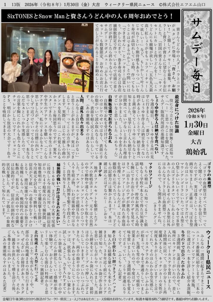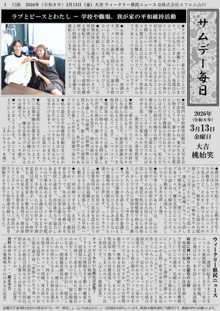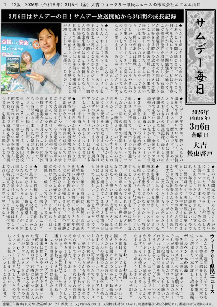 サムデー毎日毎週更新! 投稿者: Somedayスタッフ2026年3月14日2026年3月14日 そめだ編集長によるウィークリー県民ニュースまとめ新聞 コーナーへの投稿は毎週木曜夜6時30分ごろ締め切ります。 サムデーのメッセージフォーム あなたの投稿が放送と紙面を作ります。 ニュースといっても自分ニュースですから、ふつおた感覚で・・・ 日々の生活の中にあった「ちょっと言いたいこと」をメールしてください。